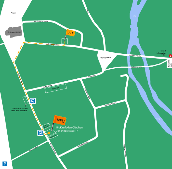 Sie finden den Bioladen und Biocafé Clärchen inmitten der Altstadt von Erfurt, nahe der Krämerbrücke, direkt zwischen dem Wenigermarkt und dem Anger.